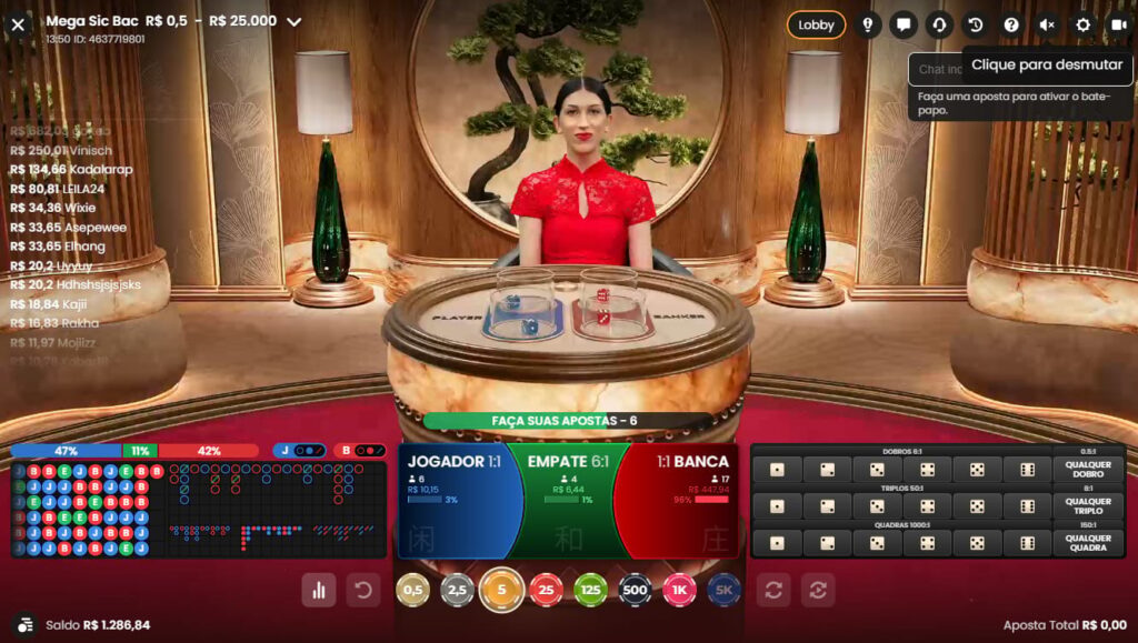 Mega Sic Bac é um jogo de dados ao vivo, onde jogadores apostam no Jogador, Banqueiro, Empate ou Apostas paralelas. Utiliza quatro dados e Mega Multiplicadores que podem aumentar os ganhos até 5.000x.