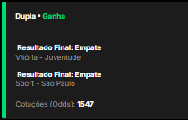 Com uma aposta de R$5, o apostador montou a odd mais alta da semana, com 1.547 com uma aposta de apenas 2 seleções! Resultado final de jogos do Brasileirão que tiveram empates importantes nos minutos finais.